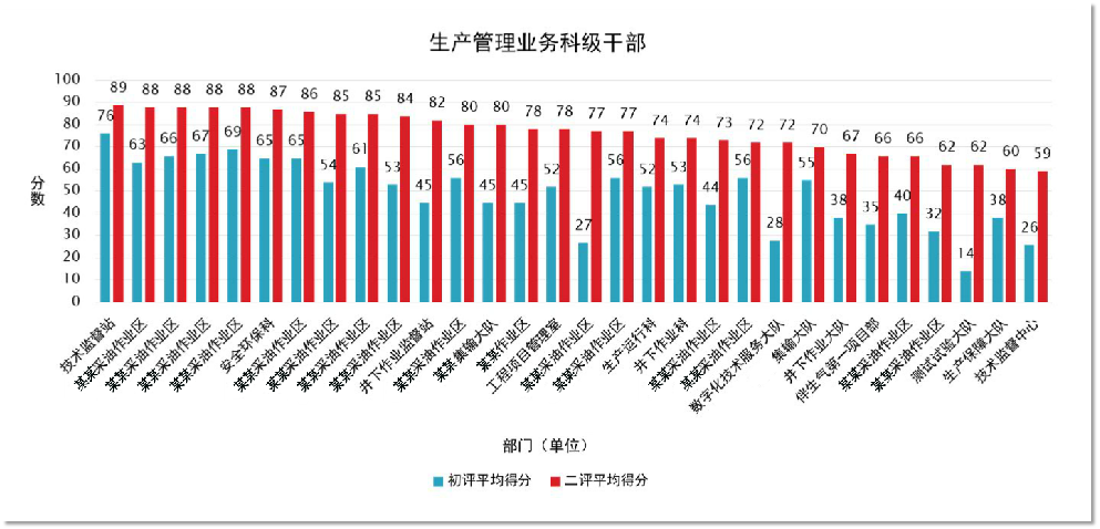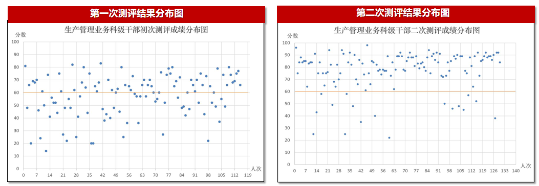 | 以“生產(chǎn)管理業(yè)務科技干部”為例,同一部門“兩次”測評結(jié)果分布圖,每個“點”代表該部門的一個員工(見下圖)。 | |||||||