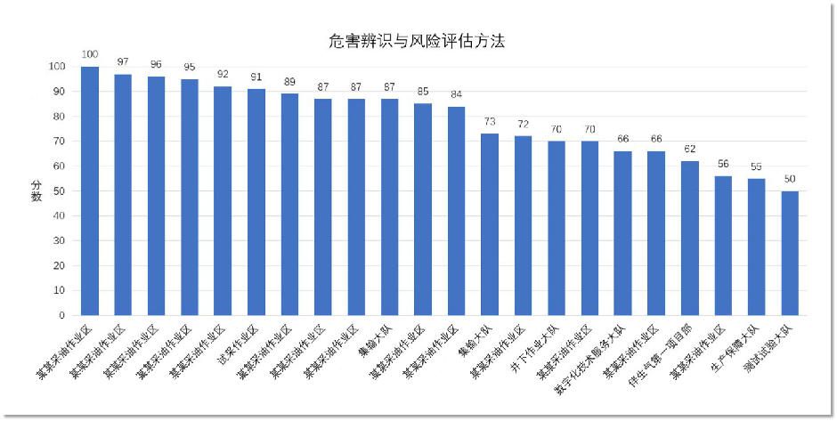| 以“生產(chǎn)管理業(yè)務科技干部”為例,精準掌握每各班組對某一個 “安全履職能力知識和技能”要求的掌握情況,比如下圖所示各班組對“危害辨識和風險評估方法”的掌握情況(見下圖) | |||||||