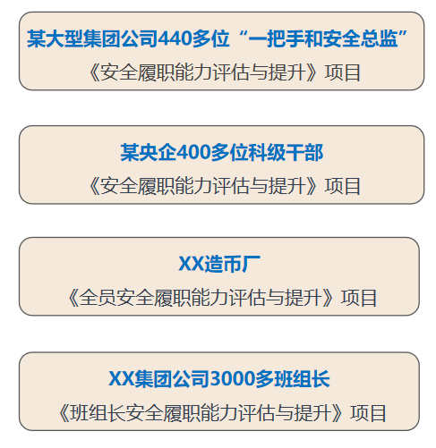 | 緊緊圍繞以“高層管理層安全領導力”建設為核心,從四個層次系統(tǒng)打造企業(yè)“安全履職能力建設”,有效提升企業(yè)安全管理績效水平。 | |||||||